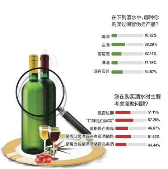 据《白皮书》调查数据反映,38.29%的受访者曾经购买过假冒伪劣白酒,而葡萄酒则有32.14%的受访者买过假冒伪劣产品,啤酒和洋酒买过假货的人群相接近,分别为16.92%和17.78%.
