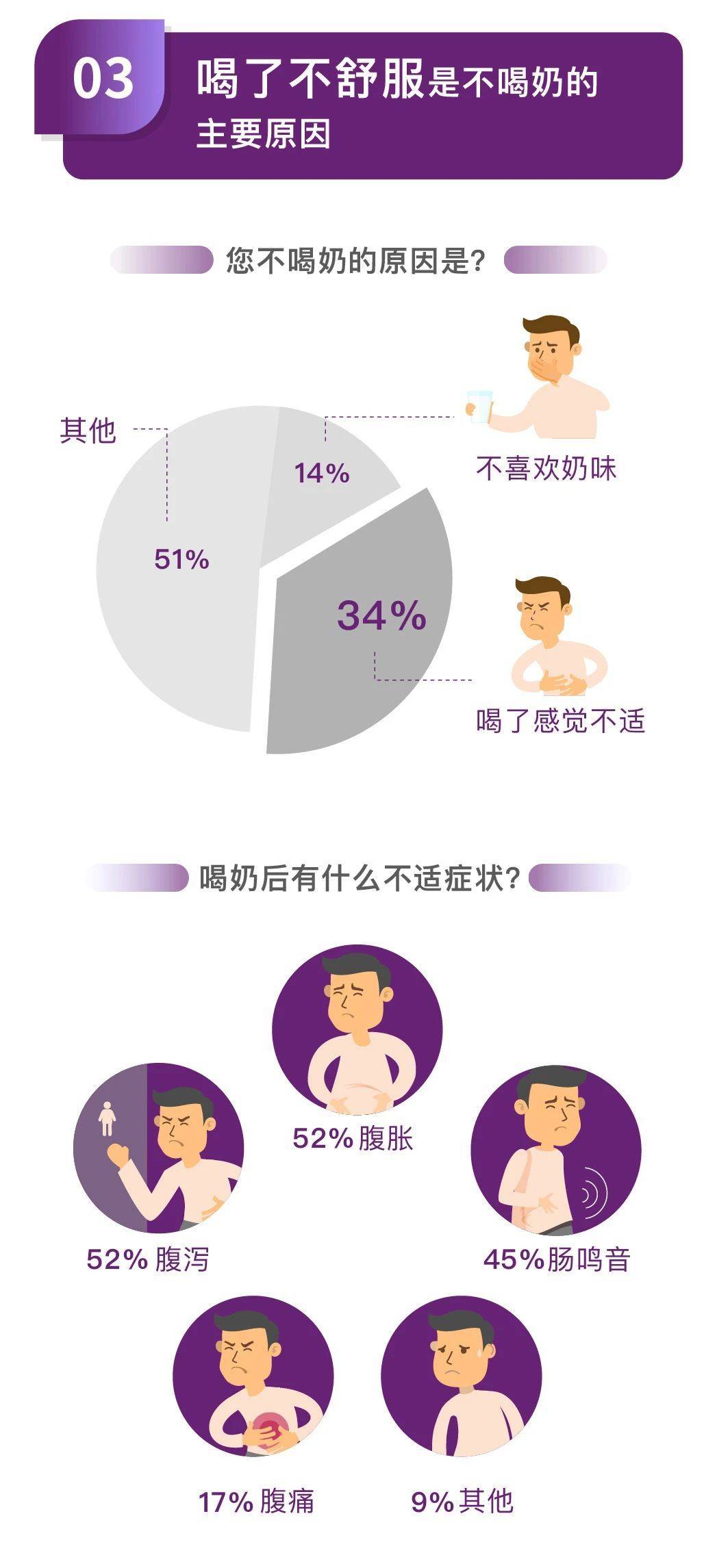 那问题来了,医生明知道牛奶有那么多益处,但仍然只有少数人选择天天喝奶呢?调查结果还告诉我们,34%不喝奶的主要原因竟然是“喝了不舒服”。