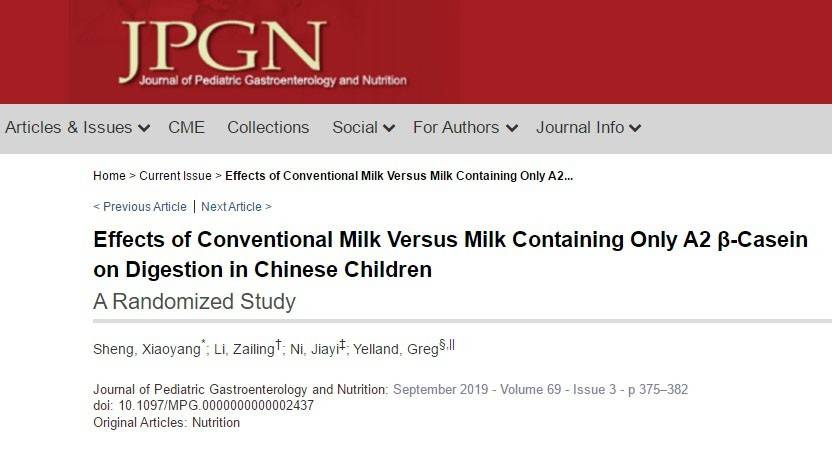 (A2蛋白质最新科学研究论文在JPGN 2019九月刊发表截图)