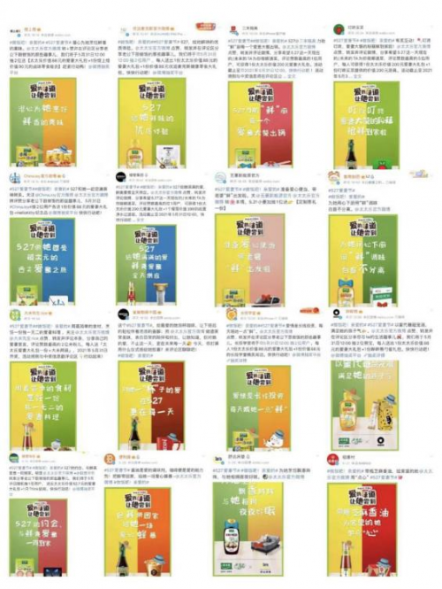 除了普通用户的全情参与,太太乐也抓住时下主流的跨界合作方式。在527爱妻节当天,80+蓝V品牌与太太乐官微联动发声,打破行业间隔,实现无碍沟通。强大的品牌传播矩阵,将爱妻节声量推至顶峰。每个品牌一边承接“做饭吧!亲爱的”主题,一边链接自身品牌特性,打造千变万化的发声文案。通过代数级的多品牌星星之火,在全网呈现出几何级的跨行业燎原之势,为今年的太太乐527爱妻节实现华丽收官!