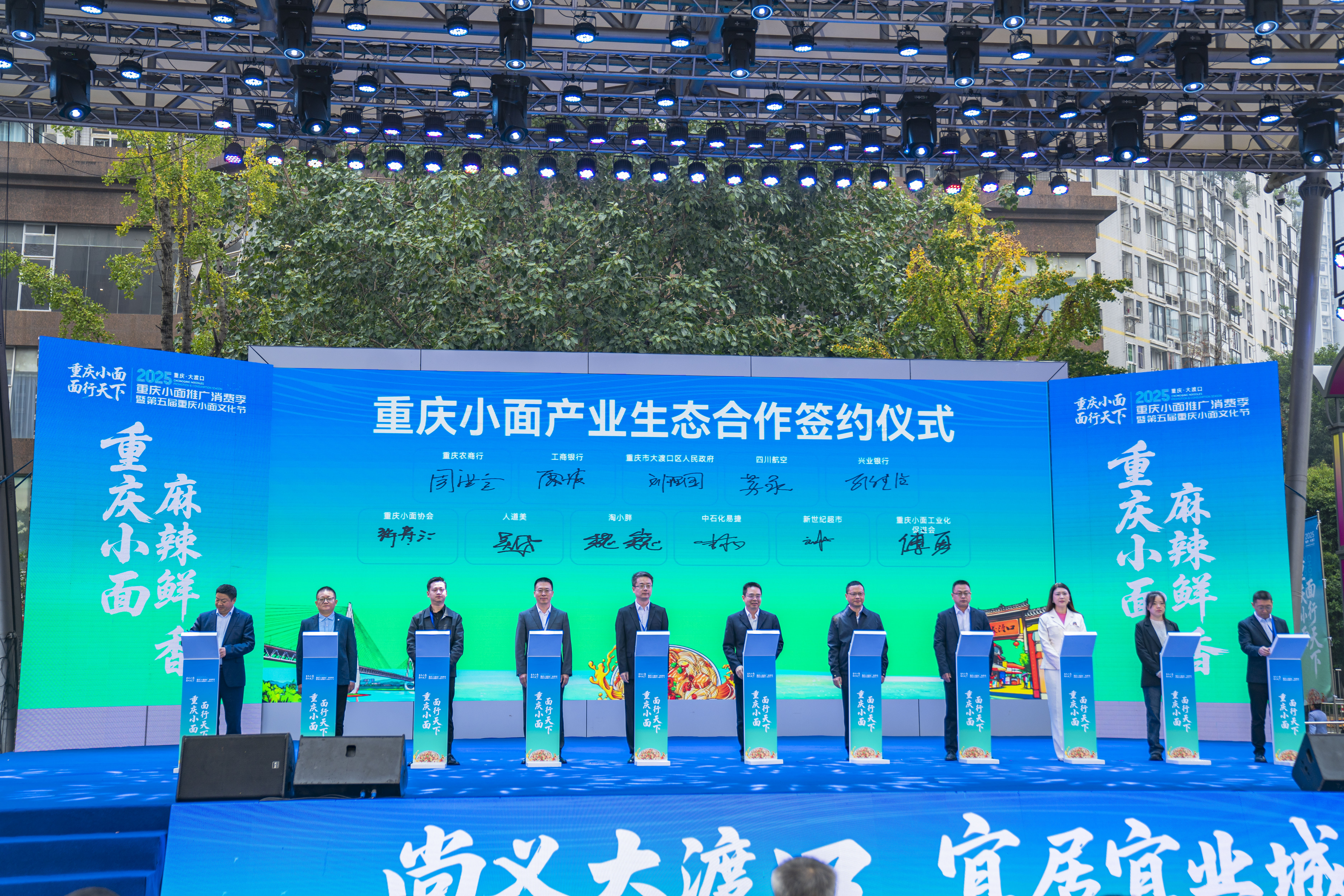 重庆小面供应链合作签约环节,大渡口与四川航空、工商银行、重庆小面协会、重庆工业促进会等达成合作协议,将携手从航空渠道、金融支持、线下零售等维度,为小面产业搭建“产、销、服”一体化生态网络。