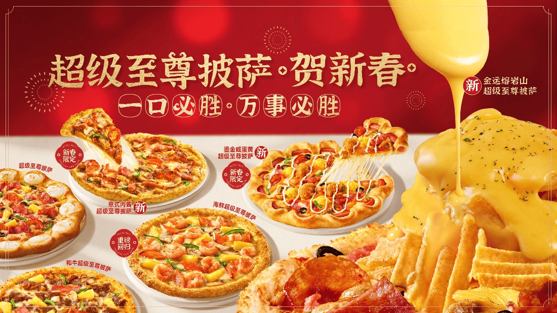 同时,必胜客带来全新的融合创意——“鸿运熔岩山披萨”与“金运熔岩山披萨”,为春节餐桌增添新意。两款产品在披萨中加入乐事大波浪薯片,分别搭配意式肉酱与咸蛋黄风味酱,传递“鸿运金运,滚滚而来”的新年吉言,为新年团聚注入轻松有趣的仪式感。消费者还可在全系列口味与饼底中选择,以加购升级的方式,定制属于自己的那份“必胜”组合,让节日的欢愉与美味同步加倍。